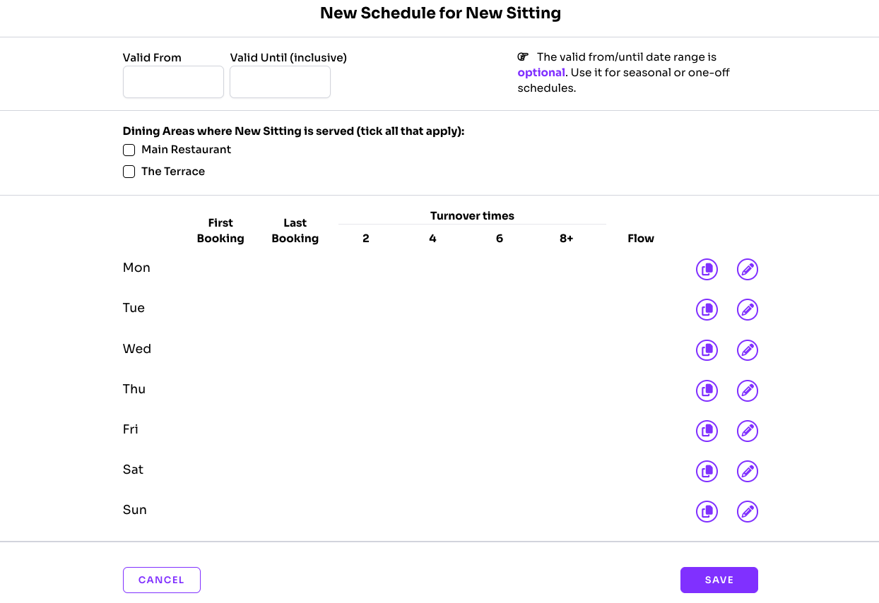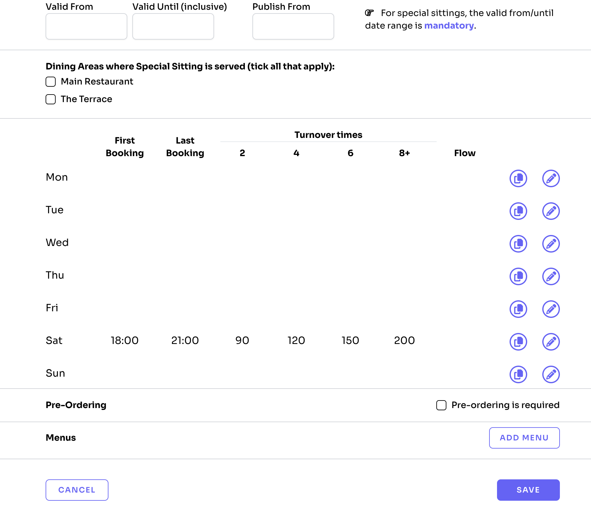 In both Opening & Closing Times and Sittings, you can set a Valid From and Valid Until range to create a schedule that applies only within a specific time frame. This is useful for events like holidays, seasonal hours, or one-off closures.