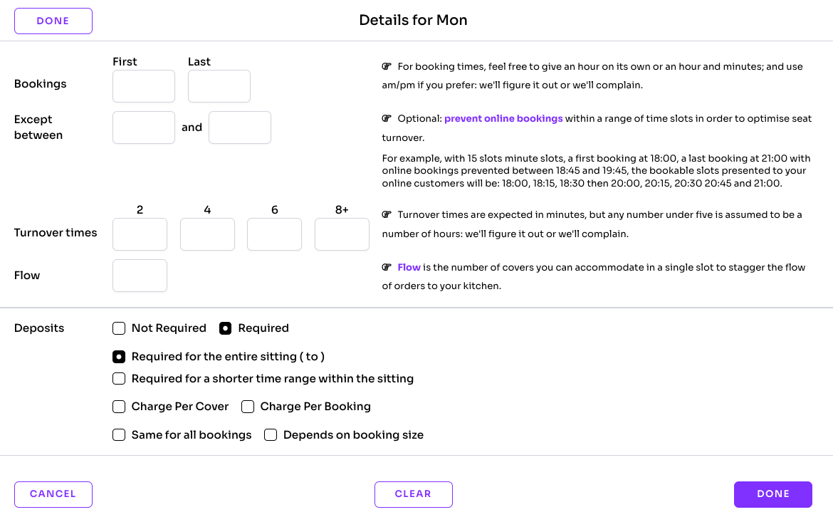 - Max covers for an online booking: Set the maximum number of guests allowed per online booking.